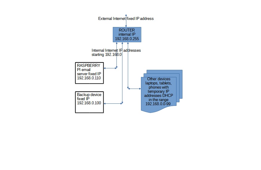 This section details the internet setup needed so that the web site and email can function on on the internet, both on your internal network and externally. Normally there is a router which is directly connected to the internet. The email server is then just one device on the internal network behind the router.